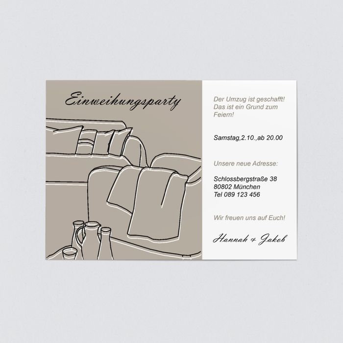 Mit professionell gedruckten Einladungskarten erzielst du mehr Aufmerksamkeit. Oft werden die Einladungskarten außerdem dazu verwendet Familie und Freunde über den Umzug zu informieren und Sie in das neue Heim zu laden. Oder teilen Sie ihnen auf diesem Weg Ihre neue Adresse mit und fügen Sie doch ein Foto zu Ihrer Gestaltung hinzu damit schon bald Besuch kommt.